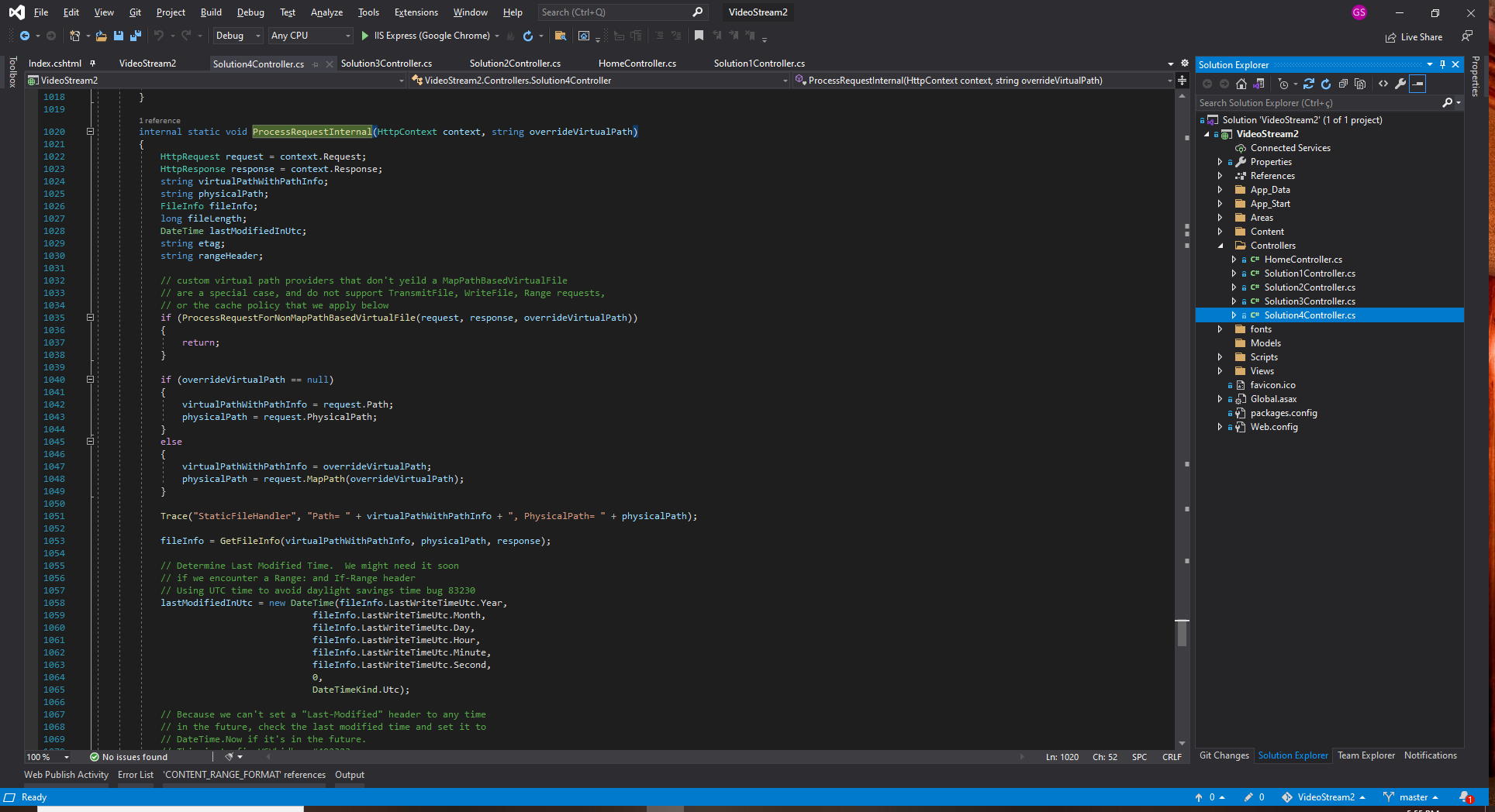 Hi Folks! Are you having trouble playing videos from the App_Data directory served by your controller? In this post I am going to demonstrate several solutions for video streaming in ASP.NET MVC. But the most complete one, the final solution (Solution4controller) in the source-code takes the cake, allowing the user to rewind and forward the video as they please. So, let's enumerate the solutions: