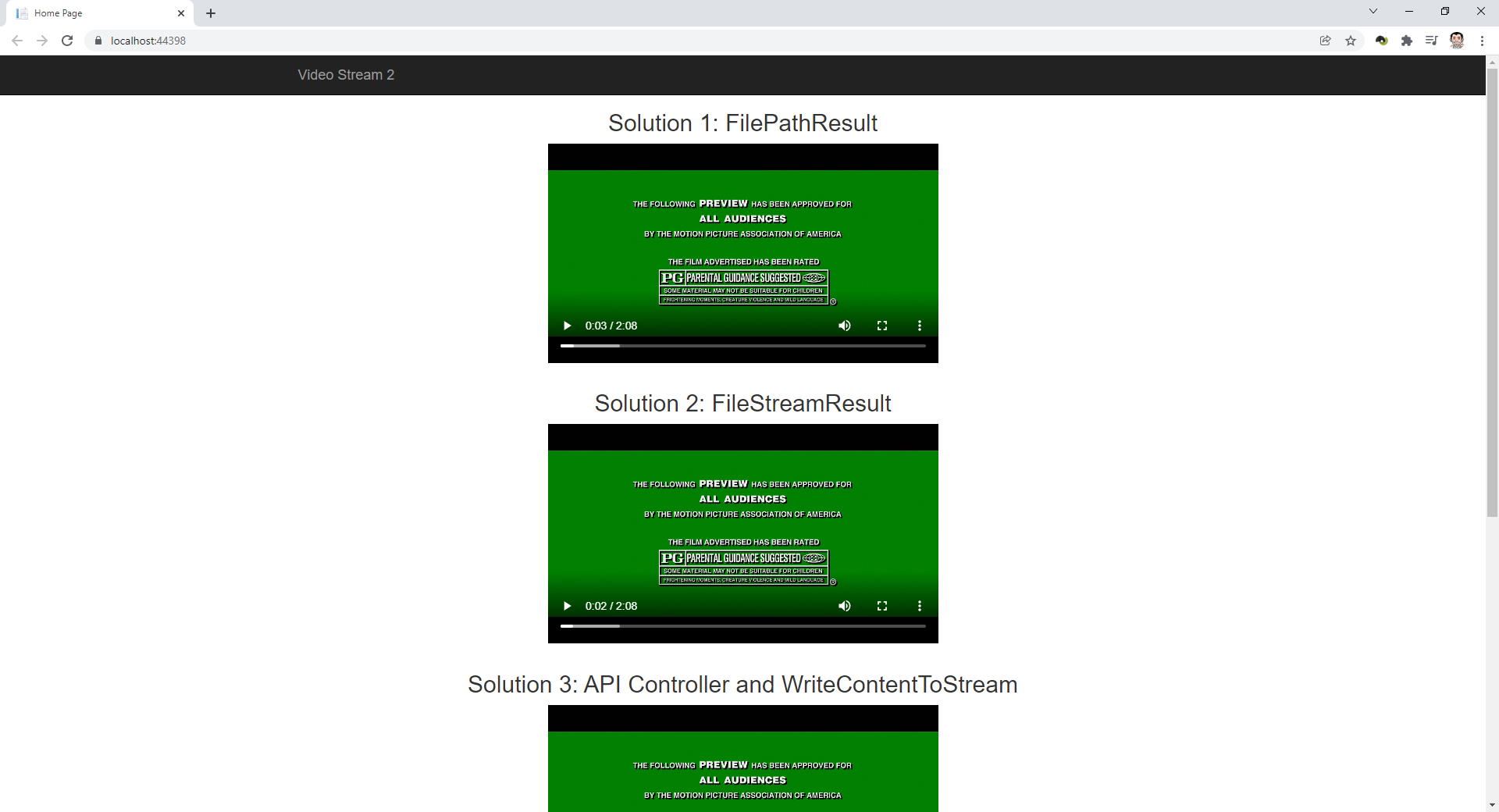 3. Solution 3: works, but it's also limited. Uses an action method called WriteContentToStream to stream the video back to the client (video playback doesn't rewind or can't go forward);
